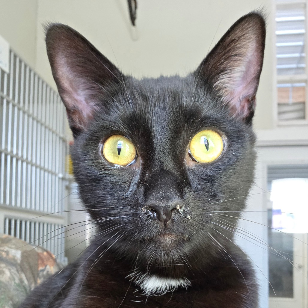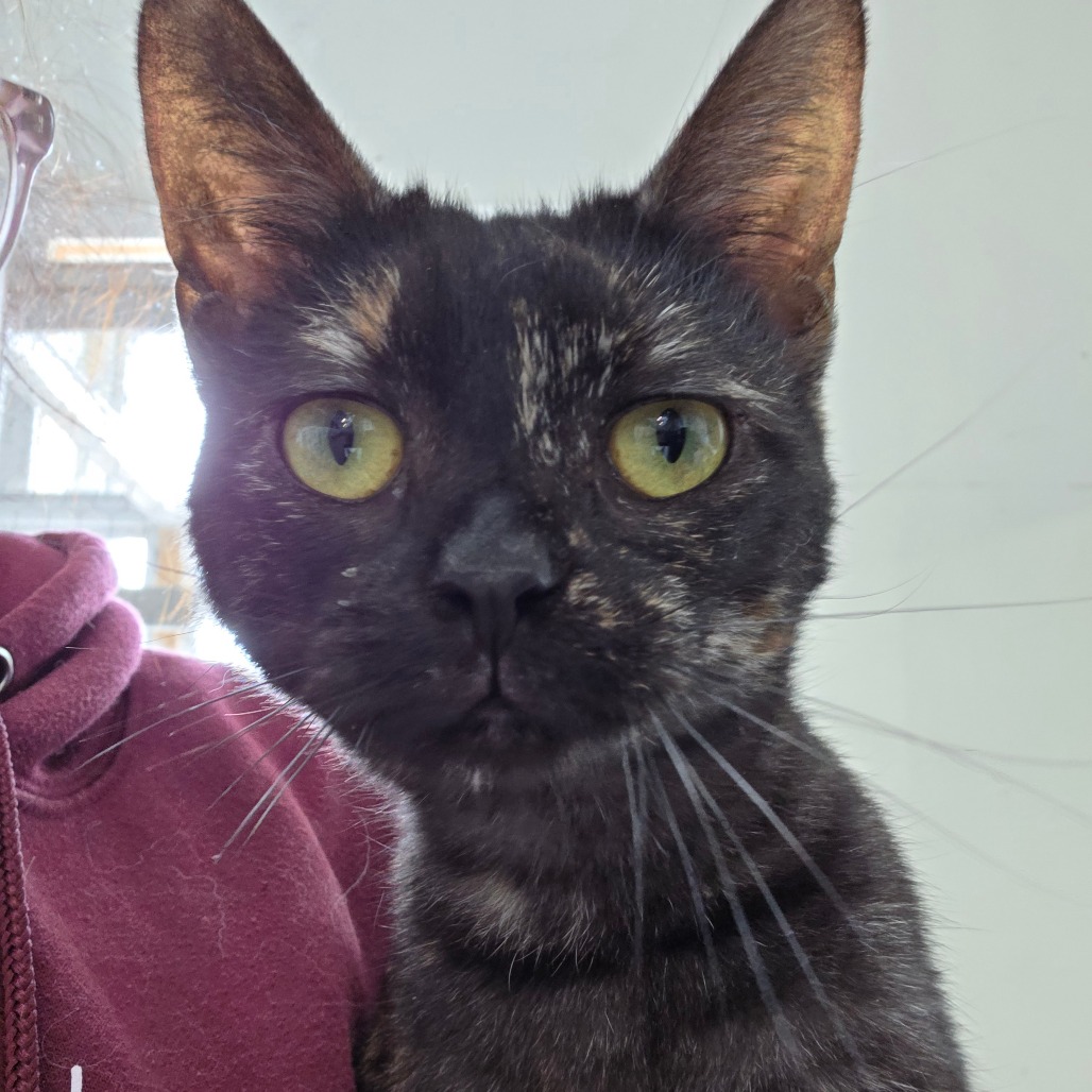 Sarah is a bit shy of the camera as you can tell, haha. She is a sweet kitten and has a shiny black coat.